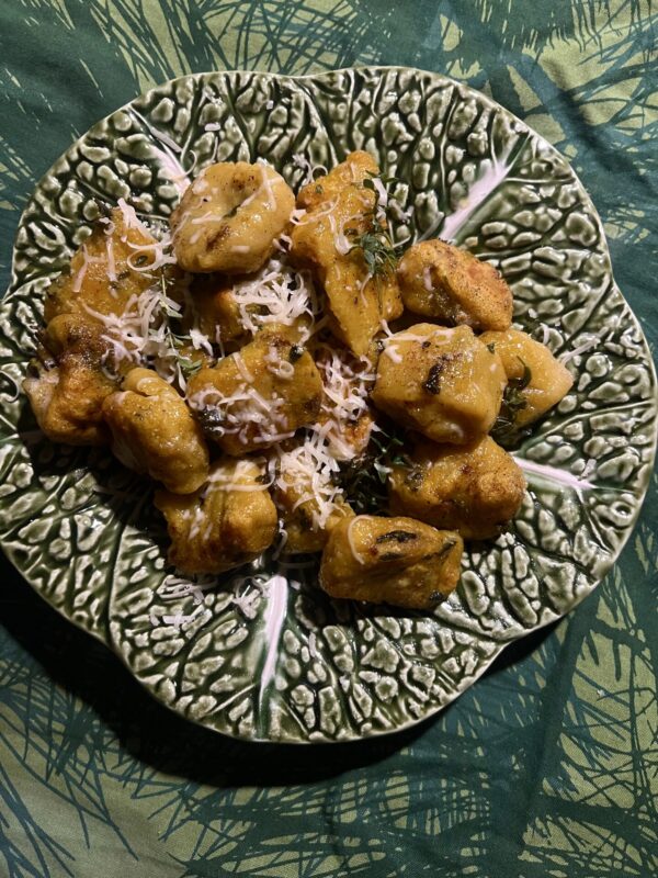 8. Lägg gnocchin på en tallrik, skeda över smöret, dekorera med salviabladen och riv över parmesan.
